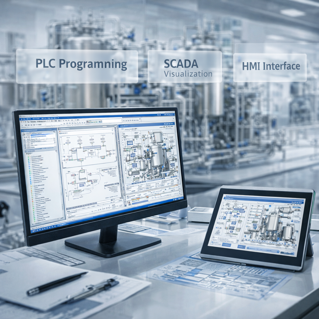 Development and implementation of control software (e.g. PLC/SCADA/HMI) for customized plants and units